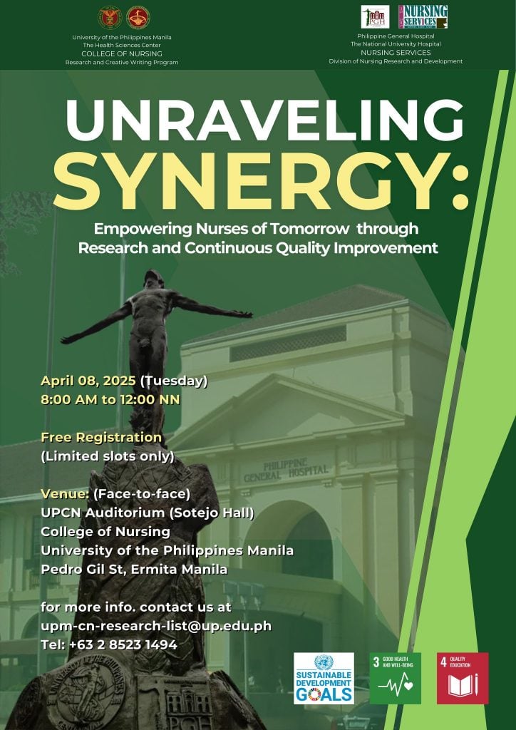 The University of the Philippines College of Nursing (UPCN) and the Philippine General Hospital Nursing Services through the Division of Nursing Research and Development (DNRD) will conduct the 2025 Nursing Research Forum, with the theme: “Unraveling the Synergy: Empowering Nurses of Tomorrow through Research and Continuous Quality Improvement.”