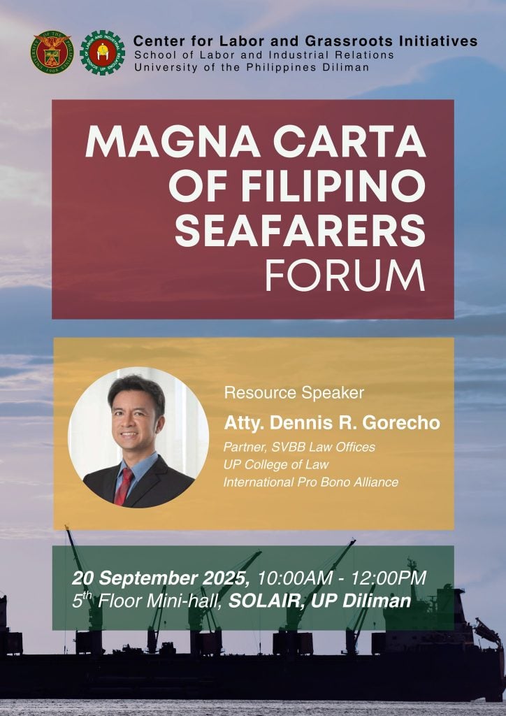 The UP SOLAIR Center for Labor and Grassroots Initiatives (CLGI) thus invites seafarer groups and trade unions, employer groups and manning agencies, government implementers and policymakers, advocates, and other stakeholders to take part in a forum on the Magna Carta of Filipino Seafarers.