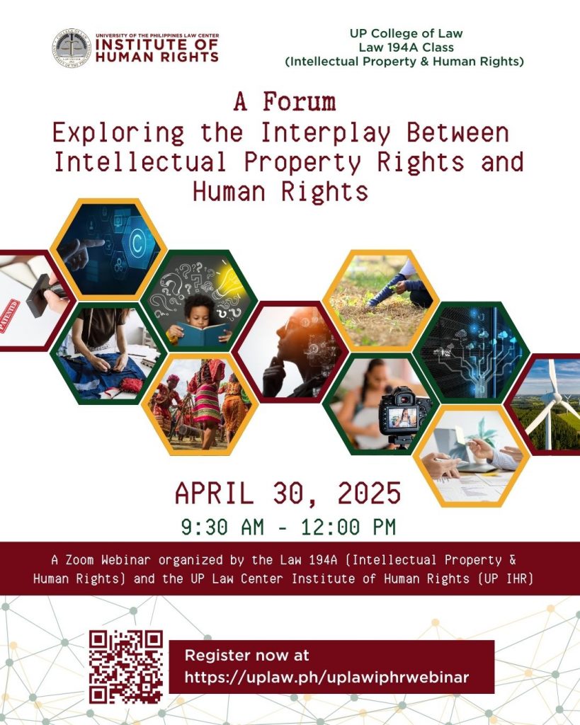 In celebration of National Intellectual Property Rights Month, the UP Law Center Institute of Human Rights (UP IHR), in partnership with the Law 194A (Intellectual Property and Human Rights) class of the UP College of Law, invites you to an online forum titled “A Forum Exploring the Interplay Between Intellectual Property Rights and Human Rights.” The event will be held via Zoom on Wednesday, 30 April 2025, from 9:30 AM to 12:00 NN.