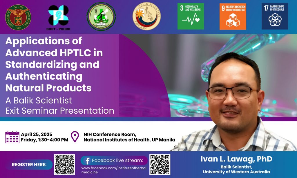 The Institute of Herbal Medicine (IHM), National Institutes of Health, University of the Philippines Manila, in partnership with the Department of Science and Technology – Philippine Council for Health Research and Development (DOST-PCHRD), through the Balik Scientist Program, warmly invites you to the Exit Seminar Presentation of Balik Scientist Dr. Ivan Lawag on April 25, 2025, from 1:30 PM to 4:00 PM at the NIH Conference Room, 1st Floor, NIH Building, UP Manila, and via Zoom.