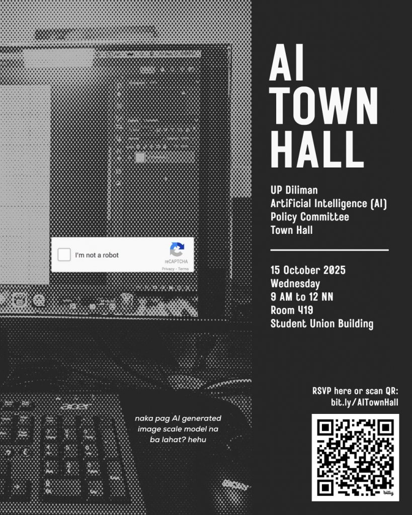 The UP Diliman Office of the Vice Chancellor for Academic Affairs (OVCAA) and the Office of the Vice Chancellor for Student Affairs (OVCSA) invite UPD students to attend the Artificial Intelligence (AI) Policy Consultation Town Hall.