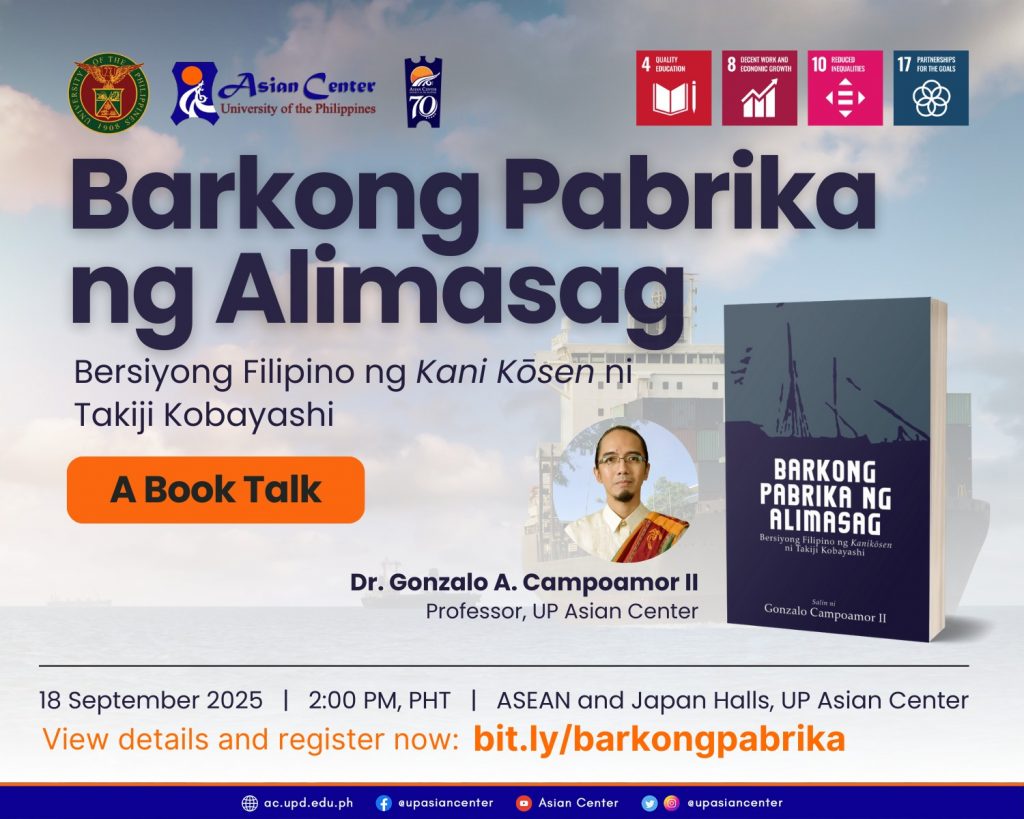 Join us for an engaging onsite book talk on Barkong Pabrika ng Alimasag: Bersiyong Filipino ng Kani kosen ni Takiji Kobayashi—a groundbreaking Filipino translation of the Japanese classic that exposed the harsh realities of labor and exploitation.