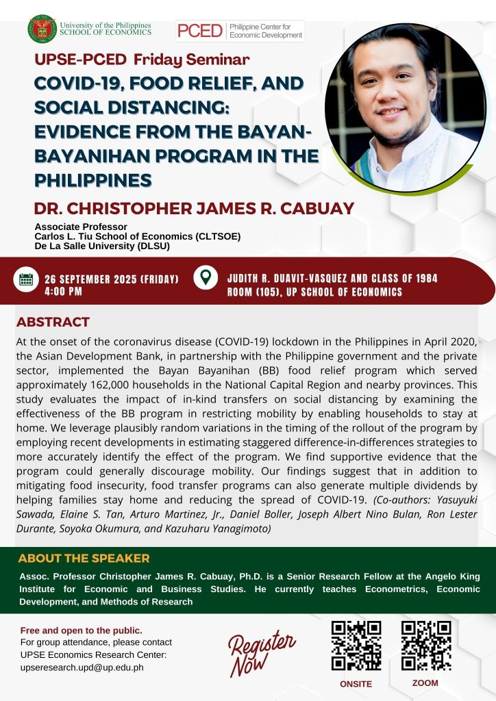π§ ππ‘At the height of the COVID-19 lockdown in the Philippines, the Bayan-Bayanihan (BB) food relief program reached over 162,000 households in Metro Manila and surrounding areas. Join us, and find out whether in-kind food transfers did more than alleviate hunger, but also reduced mobility, addressing both food insecurity and public health.