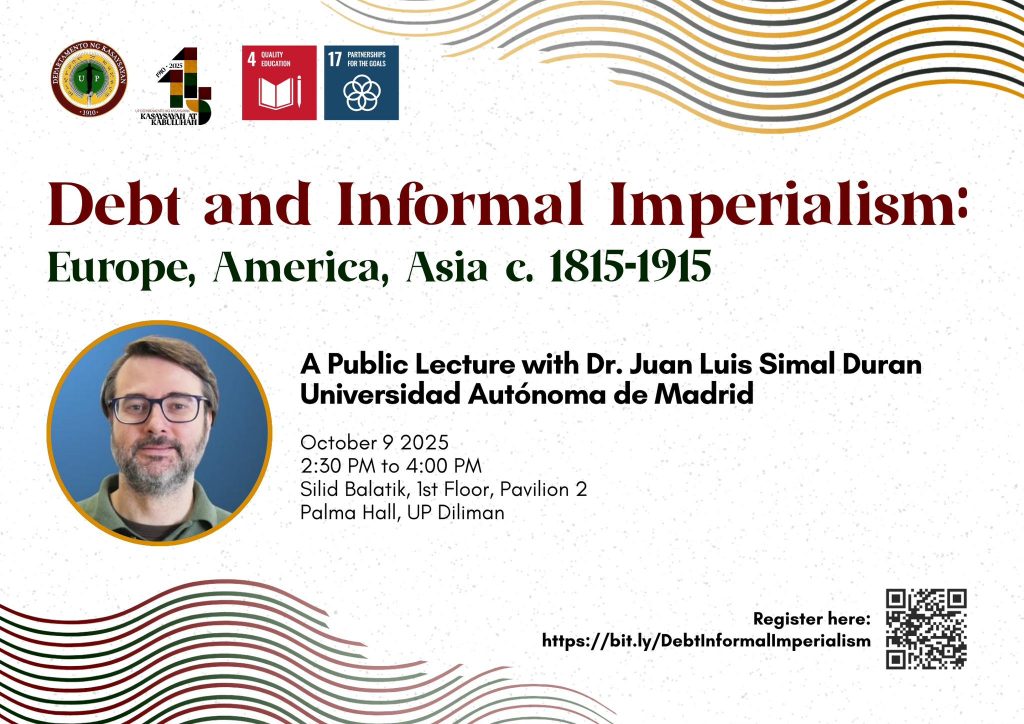 The Department of History would like to invite everyone to attend the public lecture of Dr. Juan Luis Simal Duran (Universidad Autónoma de Madrid) entitled “Debt and Informal Imperialism: Europe, America, Asia c. 1815-1915”. The lecture will be held on October 9, 2025 (Thursday) 2:30 – 4:00 PM at Silid Balatik, 1st Floor, Pavilion 2, Palma Hall, UP Diliman.