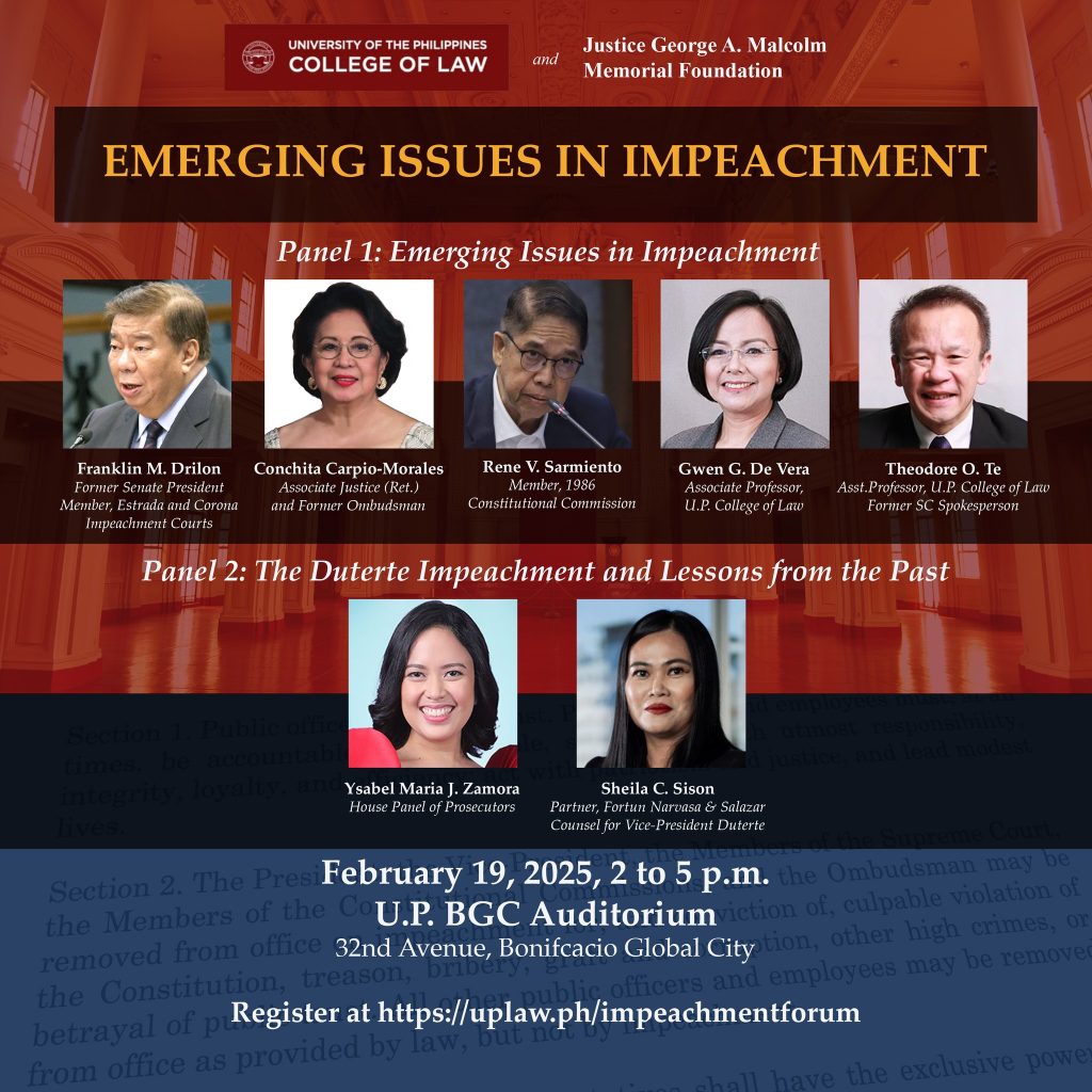 The University of the Philippines College of Law and the Malcolm Foundation invite the public to “Emerging Issues in Impeachment,” a legal forum on February 19, Wednesday, 2 to 5 p.m. at the UP BGC Auditorium (32nd Ave., Taguig City).