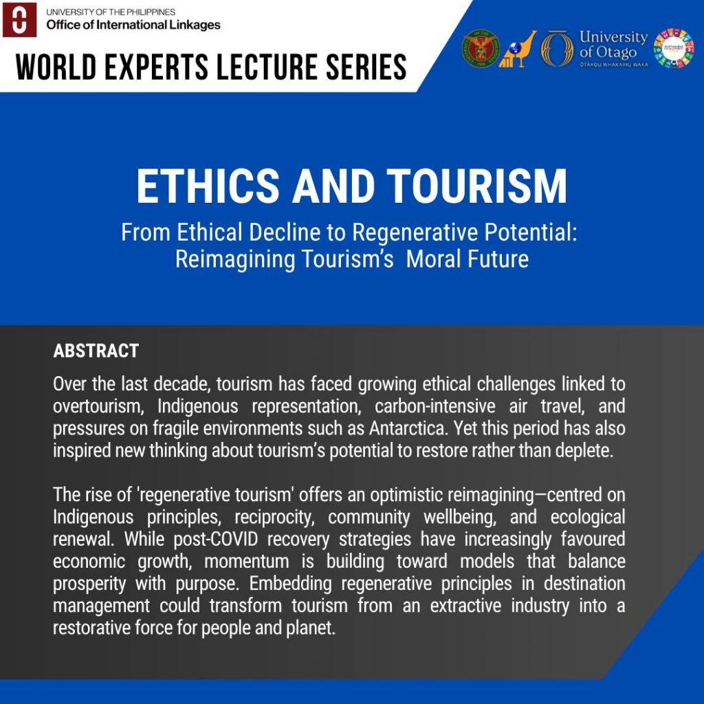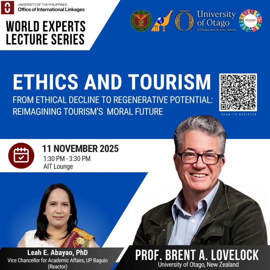 The UP Asian Institute of Tourism, in partnership with the UP Office of International Linkages and the UP Baguio College of Social Sciences, invites everyone to the World Experts Lecture Series (WELS) entitled “Ethics and Tourism. From Ethical Decline to Regenerative Potential: Reimagining Tourism’s Moral Future.”