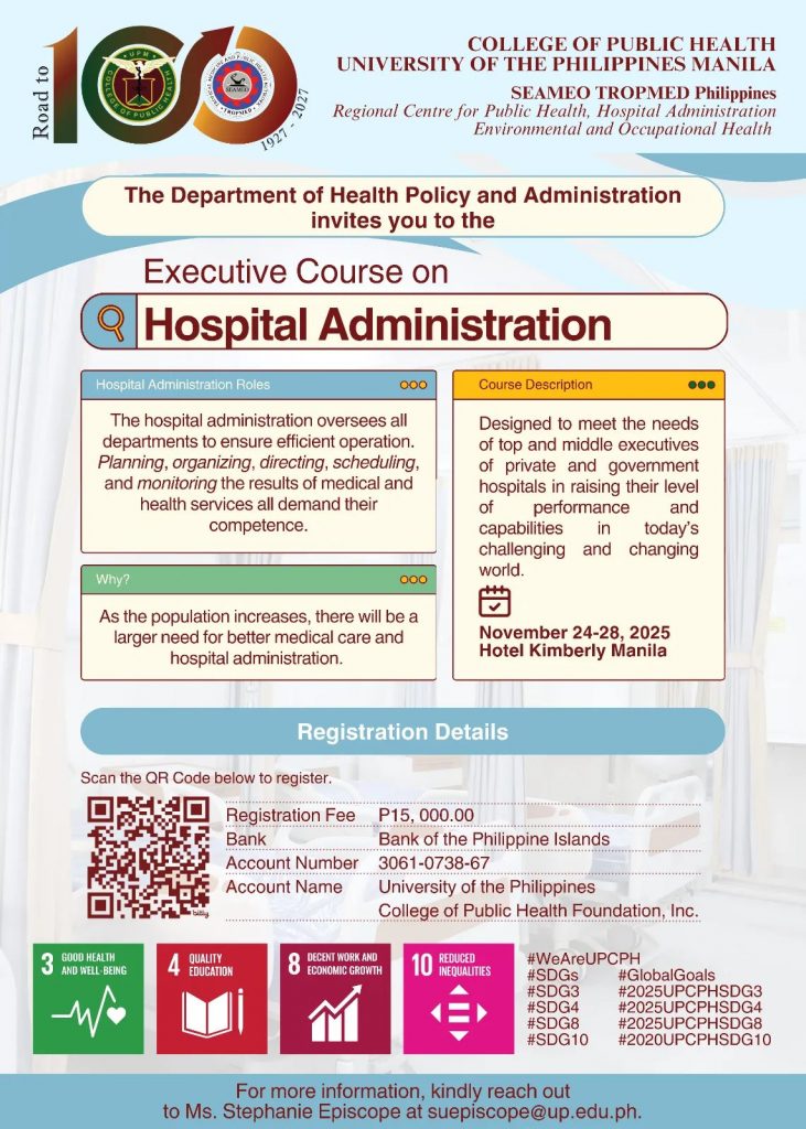 The Department of Health Policy and Administration – College of Public Health, University of the Philippines Manila, invites you to the Executive Course on Hospital Administration on November 24-28,2025 at Hotel Kimberly Manila.