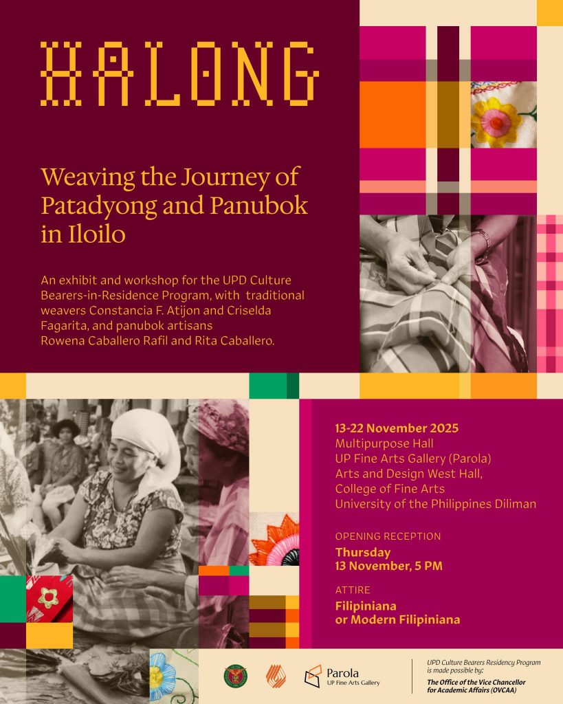 We warmly invite everyone to the opening of Halong: Weaving the Journey of Patadyong and Panubok in Iloilo, an exhibition and workshop for the UP Diliman Culture Bearers-in-Residence Program, happening on Thursday, November 13, 5:00 PM, at Parola.