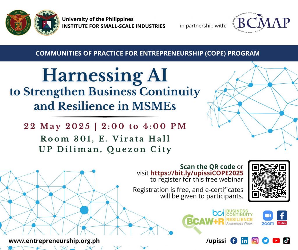 In observance of this year’s Business Continuity & Resilience Awareness Week, the UP Institute for Small-Scale Industries, in partnership with the Business Continuity Managers Association of the Philippines, presents “Harnessing AI to Strengthen Business Continuity and Resilience in MSMEs”.