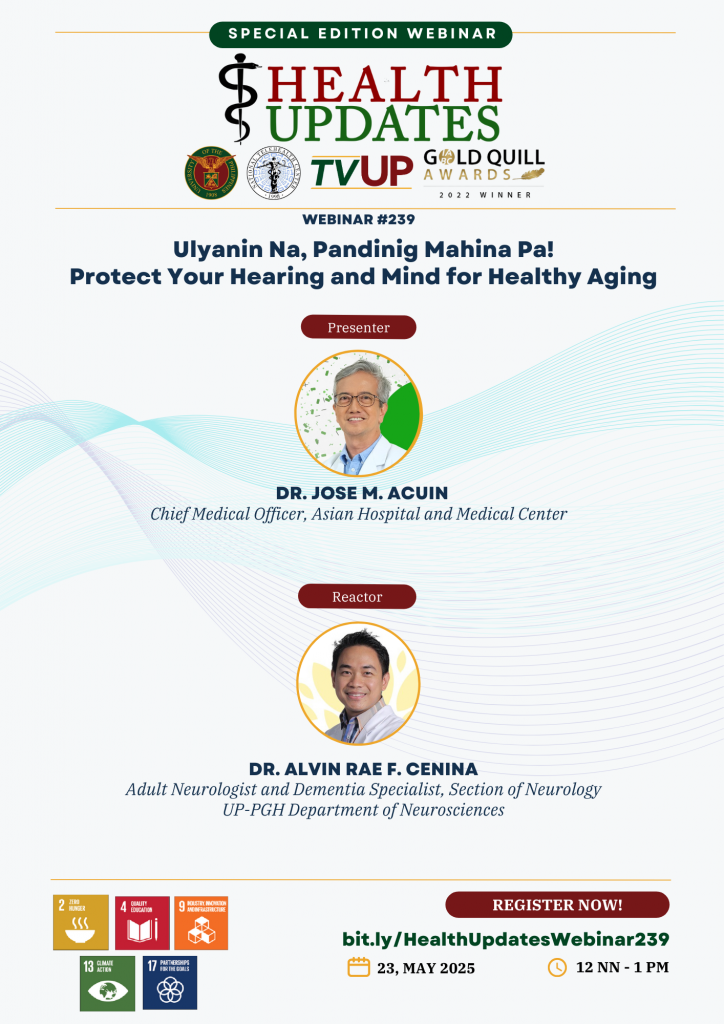 Our main speaker this week is the Chief Medical Officer of Asian Hospital and Medical Center, Dr. Jose M. Acuin. Our reactor is a practicing adult neurologist and dementia specialist from the UP-PGH Section of Neurology, Dr. Alvin Rae F. Cenina.