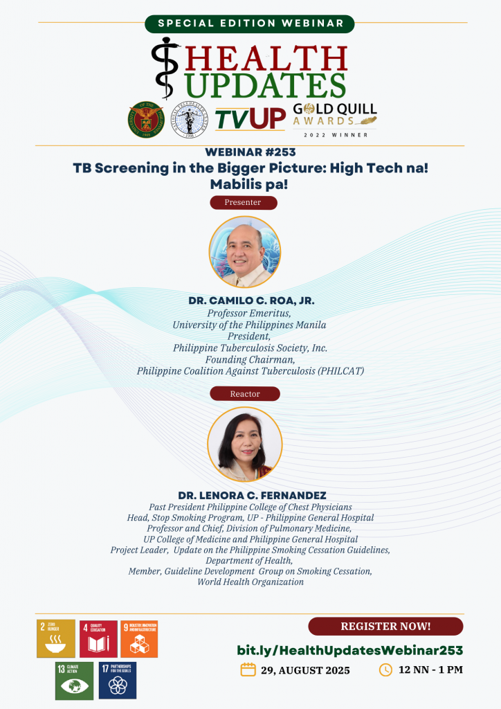 Our main presenter is Dr. Camilo C. Roa, Jr., who is the President of the Philippine Tuberculosis Society Inc.. He is also the Founding Chairman of the Philippine Coalition Against Tuberculosis and is Professor Emeritus at the University of the Philippines Manila. Our reactor is Dr. Lenora C. Fernandez, who is a past President of the Philippine College of Chest Physicians and is the Head of the UP-PGH Stop Smoking Program. She also serves as Professor and Chief of the Division of Pulmonary Medicine at the UP College of Medicine and Philippine General Hospital. She is also the Project Leader of the DOH-sponsored project on Updates on Philippine Smoking Cessation Guidelines, as well as a member of the WHO Guideline Development Group on Smoking Cessation.
