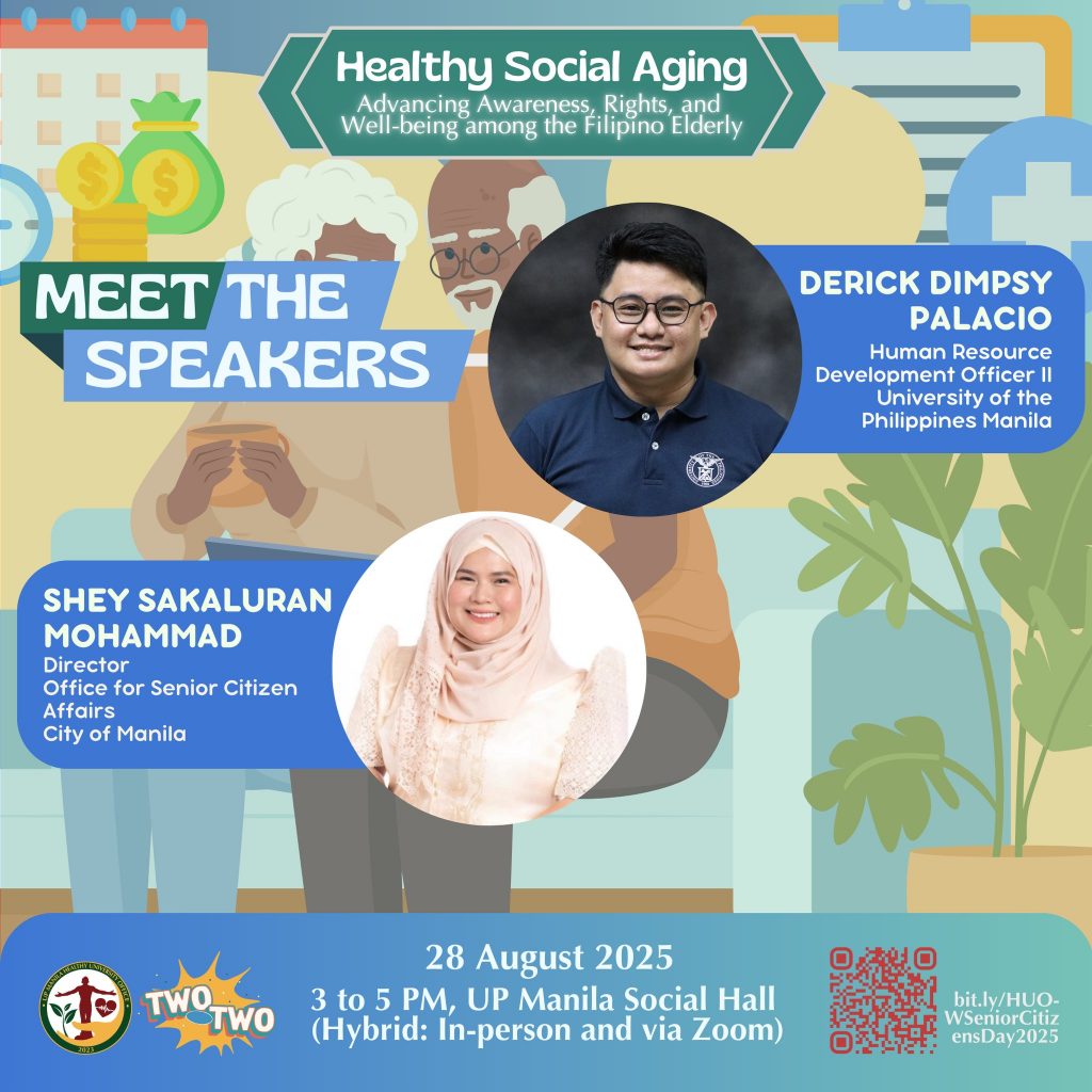 We are honored to present our speakers for Healthy Social Aging: Advancing Awareness, Rights, and Well-being among the Filipino Elderly, happening on 28 August 2025 as part of the UP Manila Healthy University Office’s 2nd Anniversary celebration with the theme “Two for Two: Celebrating HUO’s Second Year of Leadership and Collaboration Towards a Healthier University.” 🌿🎉