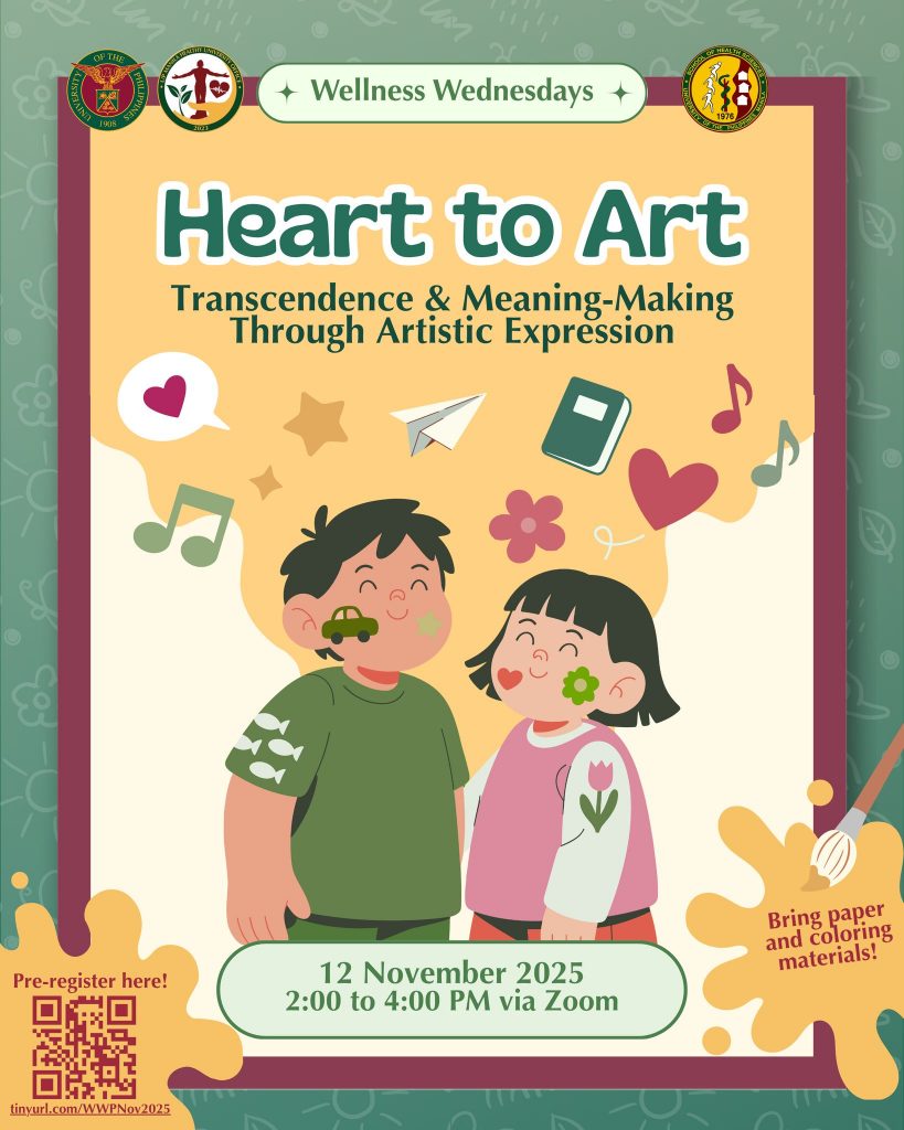 Join the UP Manila Healthy University Office and the School of Health Sciences – Koronadal for a Wellness Wednesday event titled, “Heart to Art: Transcendence and Meaning-Making Through Artistic Expression” on November 12, 2025, 2:00-4:00 PM via Zoom.