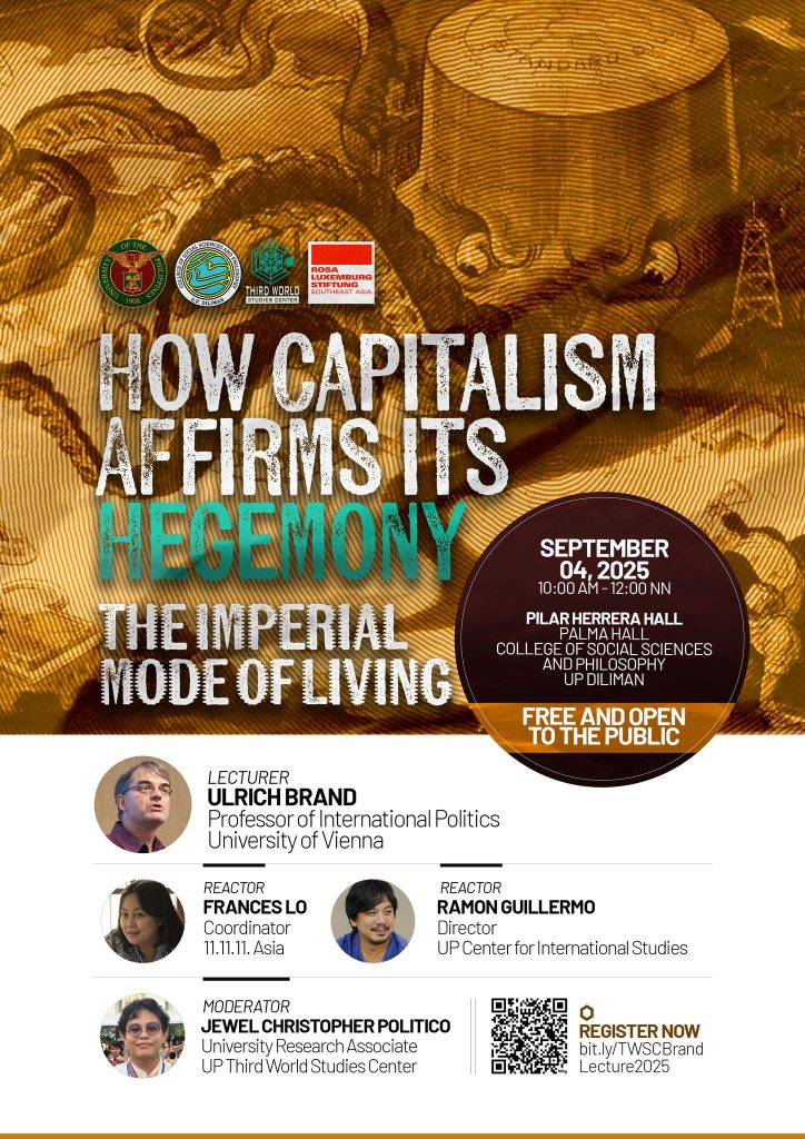 The UP Third World Studies Center (TWSC), in collaboration with the Rosa Luxemburg Stiftung Southeast Asia, invites the public to a free lecture titled “How Capitalism Affirms its Hegemony: The Imperial Mode of Living” by University of Vienna Professor for International Politics Ulrich Brand.