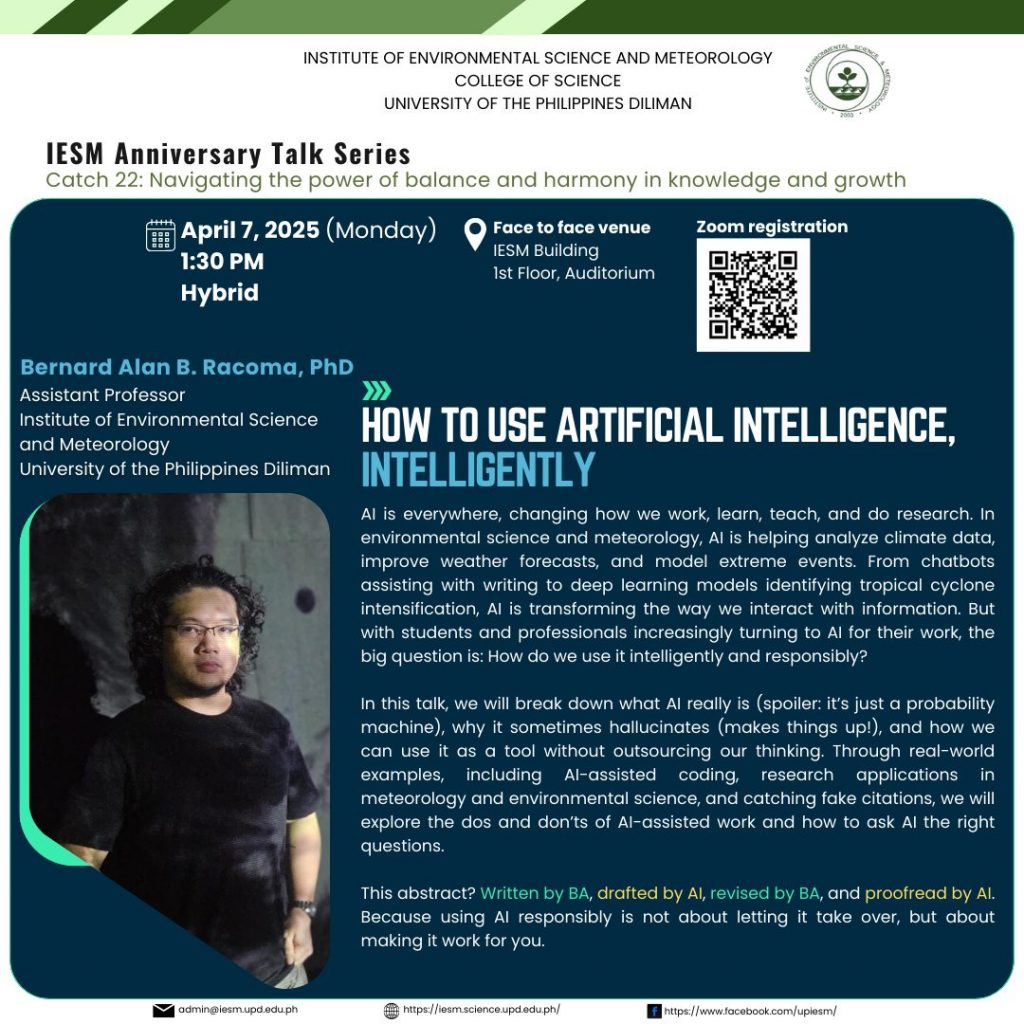 Please join us for IESM@22 Talk Series with Dr. Bernard Alan B. Racoma on “How to Use Artificial Intelligence, Intelligently” on April 7, Monday at 1:30 PM at the IESM Auditorium (hybrid).
