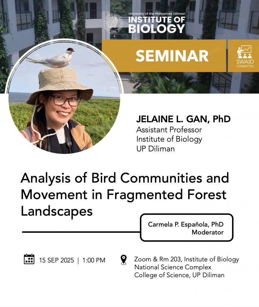 The IB Seminar of Dr. Jelaine L. Gan has been rescheduled to September 15, 2025, at 1:00 PM. The venue remains the same (Zoom and Room 203, Institute of Biology, UP Diliman). To join online, please register via the link below.