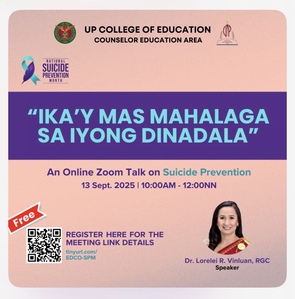 The UP College of Education – Counselor Education Area invites you to an online Zoom talk on suicide prevention entitled, “Ika’y Mas Mahalaga sa Iyong Dinadala”