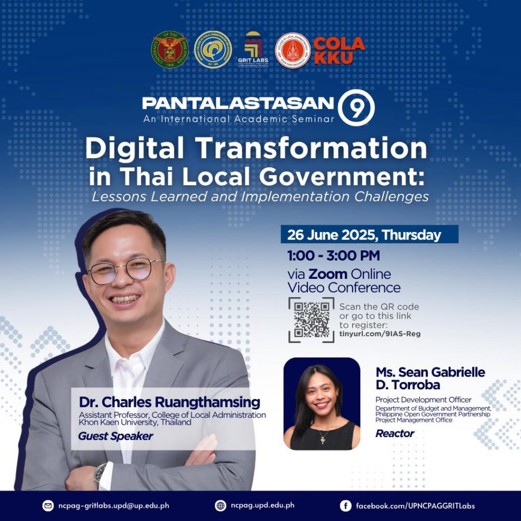 We will feature the ‘Digital Transformation in Thai Local Government: Lessons Learned and Implementation Challenges’ with Dr. Charles Ruangthamsing, Assistant Professor at the College of Local Administration, Khon Kaen University, Thailand.