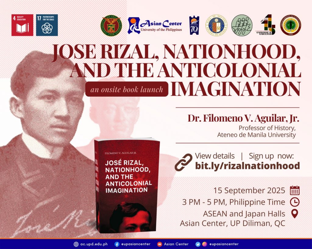 Join us for the onsite launch of Dr. Filomeno V. Aguilar Jr.’s latest book, Jose Rizal, Nationhood, and the Anticolonial Imagination, published by the Ateneo de Manila University Press. Dr. Aguilar’s book sheds fresh light on Rizal and the ilustrados’ conceptualization of an independent nation and invites us to reflect on the meaning of nationhood, identity, and freedom today.