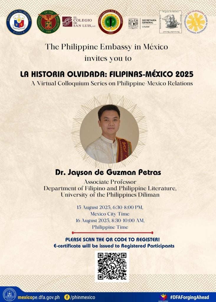 The Philippine Embassy in Mexico, in partnership with the Departamento ng Kasaysayan of the University of the Philippines, El Colegio de San Luis, and the Philippine-Mexico Studies Program, UNAM Universidad Nacional Autónoma de México, supported by the Office of Senator Loren Legarda, invites you to the seventh episode of LA HISTORIA OLVIDADA: FILIPINAS-MEXICO 2025, a virtual colloquium series on Philippine-Mexico relations, to be held via Zoom on 16 August 2025 at 8:30-10:00 A.M., Philippine time.