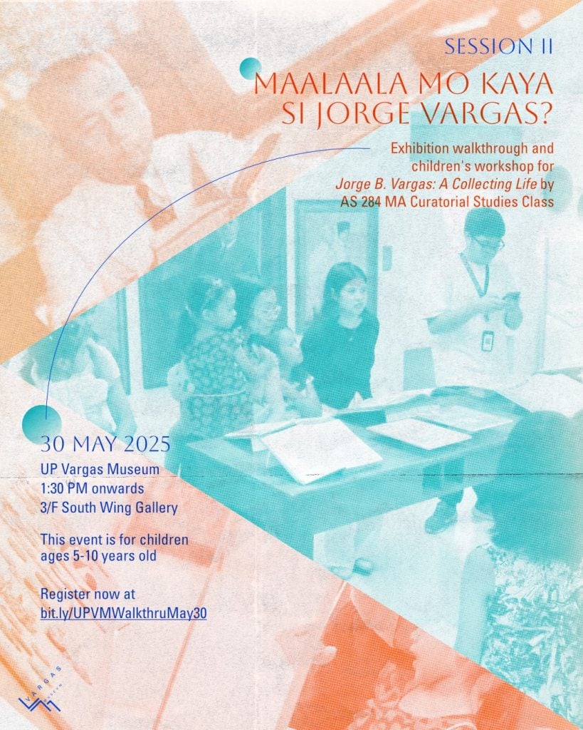The UP Vargas Museum, together with students of the Art Studies 284 Curatorial Studies class taught by museum curator Tessa Maria Guazon, presents the second session of Maalaala Mo Kaya Si Vargas?—an exhibition walkthrough and children’s workshop for our newly redesigned memorabilia exhibition, Jorge B. Vargas: A Collecting Life (Isang Buhay ng Pagtipon), on 30 May 2025, Friday, at 1:30 PM.