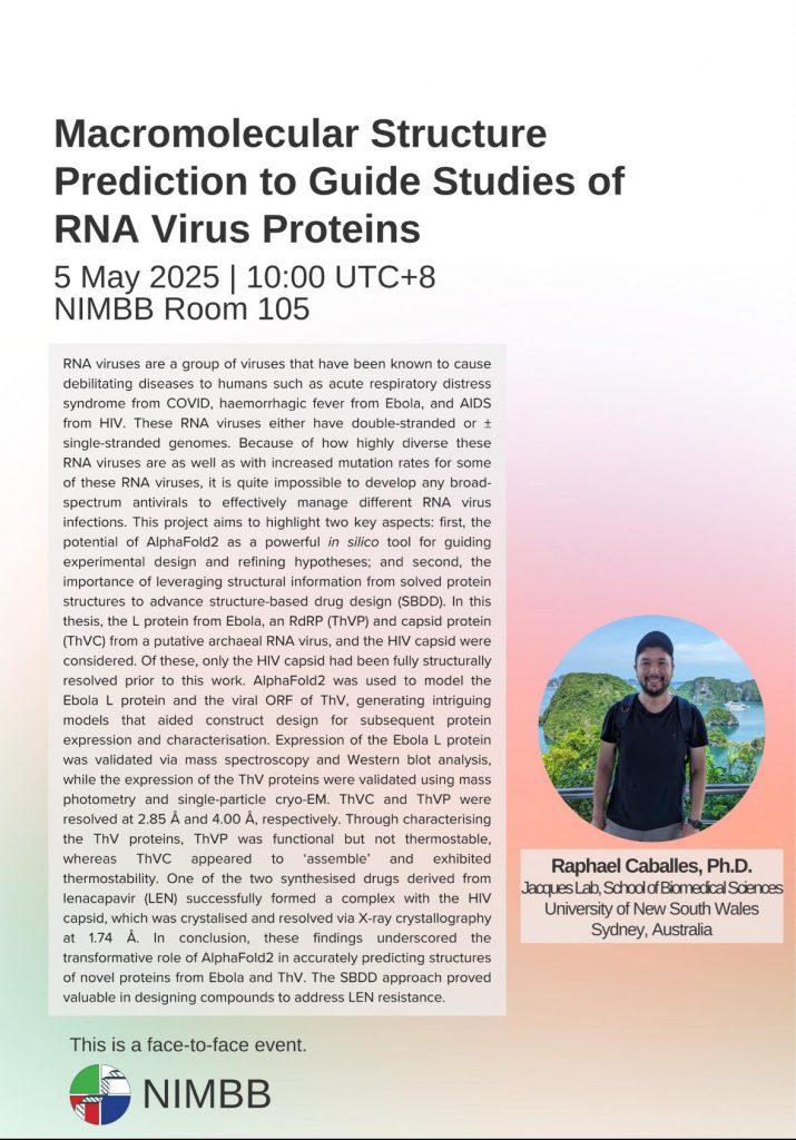 Everyone is welcome to join us for a research seminar to be given by NIMBB alumnus, Dr. Ralph Caballes. The seminar will be held on May 5, 2025 (Monday), 10 AM at NIMBB Rm 105.