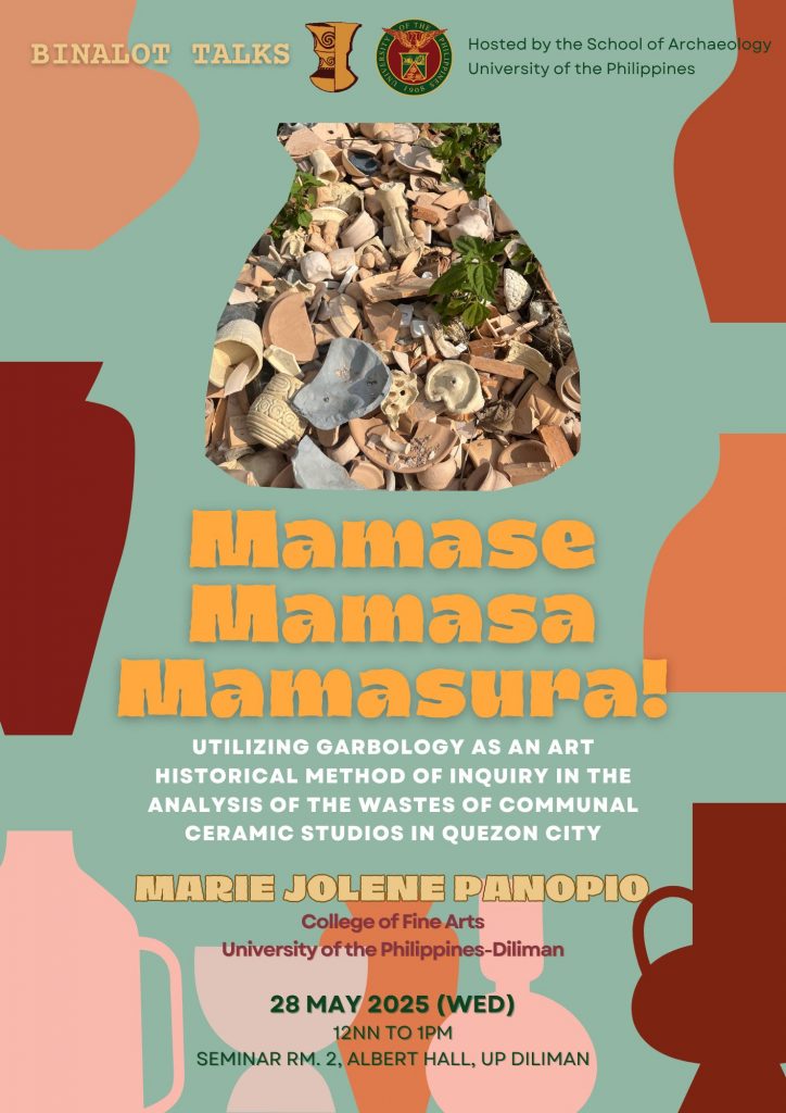Join us as Jolene Panopio explores this in detail with Mamase Mamasa Mamasura!: Utilizing Garbology as an Art Historical Method of Inquiry in the Analysis of the Wastes of Communal Ceramic Studios in Quezon City, this Wednesday (28 May 2025) from 12nn to 1pm at Seminar Rm. 2, Albert Hall, UP Diliman.