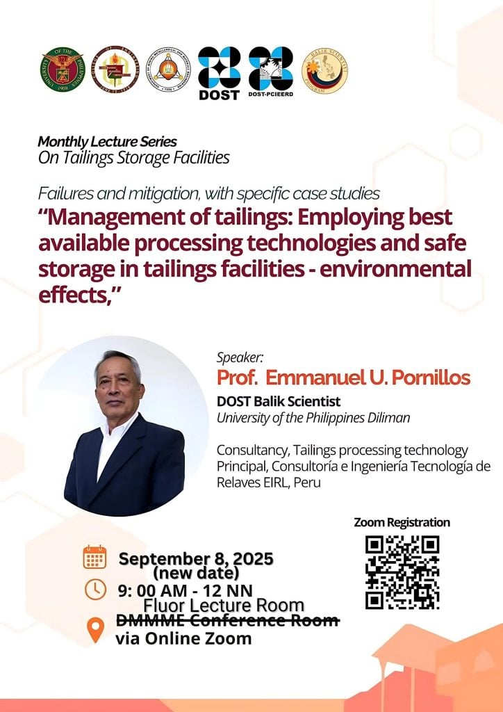 We invite you to join us for the first lecture of our Monthly Lecture Series on Tailings Storage Facilities, featuring Prof. Emmanuel U. Pornillos, a DOST-Balik Scientist with over 30 years of global experience in mine tailings management.