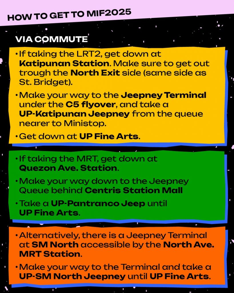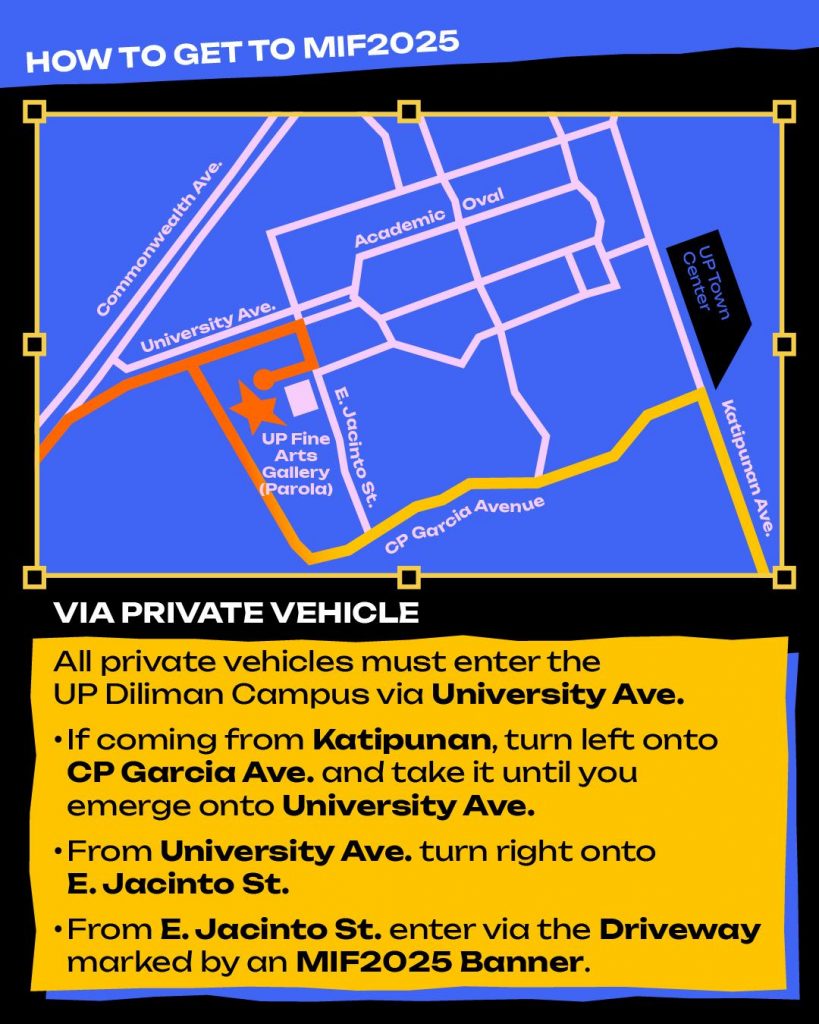 ๐Ÿ›ž By car: Enter UP Diliman via University Ave. then follow the MIF2025 banners leading to Parola.