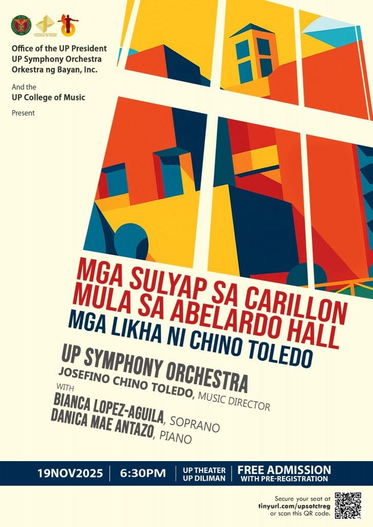 Join the UP Symphony Orchestra in an evening of works by Music Director Josefino βChinoβ Toledo, featuring soprano Bianca Lopez-Aguila and pianist Danica Mae Antazo as soloists.