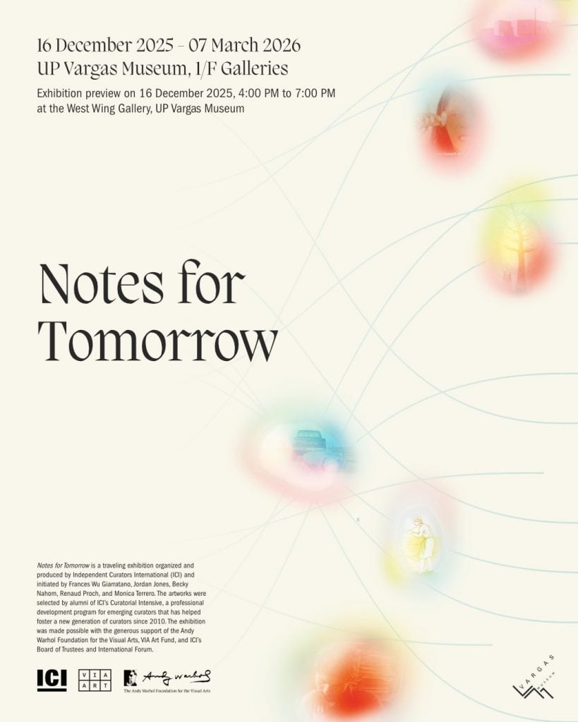 The UP Vargas Museum hosts the exhibition’s first iteration in Southeast Asia, opening on 16 December 2025, bringing together works across various geographies, narratives, and disciplines that stray from the colonial canon. The selected artists present works that question monumentality and seek the wisdom of localities. In this necessary moment of cultural transition, each work acts as a source of inspiration from the recent past toward new futures. Rather than proposing a single path forward, the artworks in Notes for Tomorrow present a network of overlapping solutions.