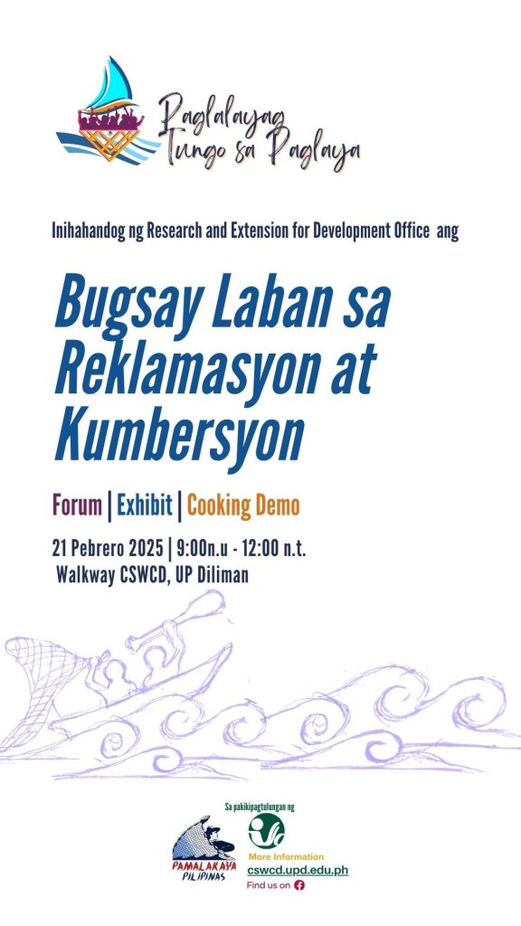 Inihahandog ng Research and Extension for Development Office (REDO) ang Paglalayag Tungo sa Paglaya: Bugsay Laban sa Reklamasyon at Kumbersyon. Tunghayan ang forum, exhibit at cooking demo sa darating na Pebrero 21, 2025, 9:00 n.u. hanggang 12:00 n.t. sa Walkway CSWCD.