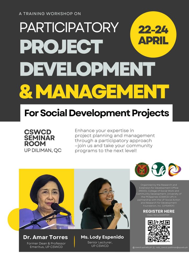 Don’t miss the chance to catch our esteemed Professor Emeritus, Former Dean Amaryllis Torres and Senior Lecturer Ms. Lody Espenido at the Participatory Project Development and Management Training on 22 to 24 April 2025!