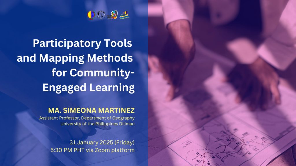 For the first Heo/Geo lecture for 2025, the Philippine Geographical Society (PGS) and the UP Department of Geography through its Geographic Information Systems and Techniques (GIST) research group, cordially invite you to a lecture of UPD Geography faculty Ma. Simeona Martinez titled Participatory Tools and Mapping Methods for Community-Engaged Learning. This online talk will be on Friday, the 31st of January 2025 at 5:30 in the afternoon.