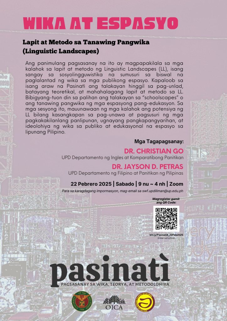 Sa patuloy na pagsusulong sa Patakarang Pangwika ng UP para sa pagpapalaganap at pagpapaunlad ng wikang Filipino bilang midyum ng pagtuturo, pananaliksik, publikasyon, at opisyal na komunikasyon, binubuksan ng Sentro ng Wikang Filipino – UP Diliman (SWF-UPD) ang rehistrasyon para sa panibagong Pasinatì: Pagsasanay sa Wika, Teorya, at Metodolohiya na “Wika at Espasyo: Lapit at Metodo sa Tanawing Pangwika.”