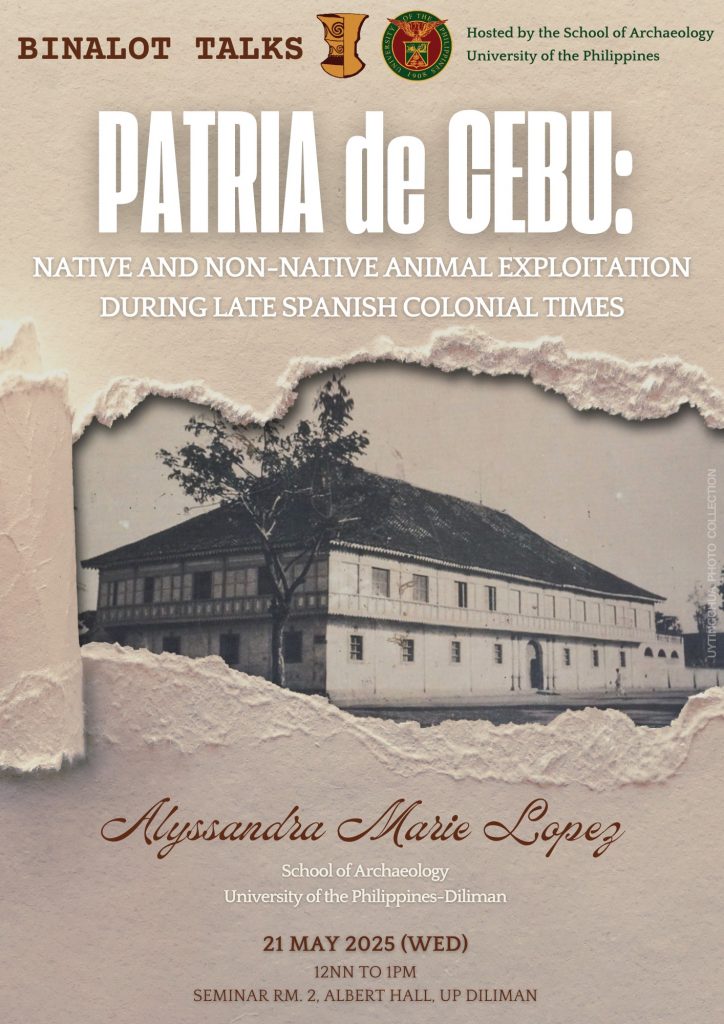 This Wednesday (21 May 2025), Alyssandra Marie Lopez shares insights from her zooarchaeological study of Spanish-period sites through “Patria de Cebu: Native and non-native animal exploitation during late Spanish colonial times” at 12nn-1pm at Seminar Rm. 2 of Albert Hall.