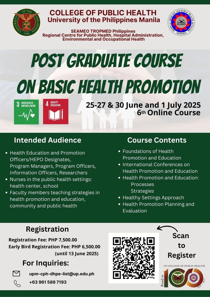 The Department of Health Promotion and Education of UP Manila College of Public Health invites you to the Post Graduate Course on Basic Health Promotion on 25-27 & 30 June and 1 July 2025.