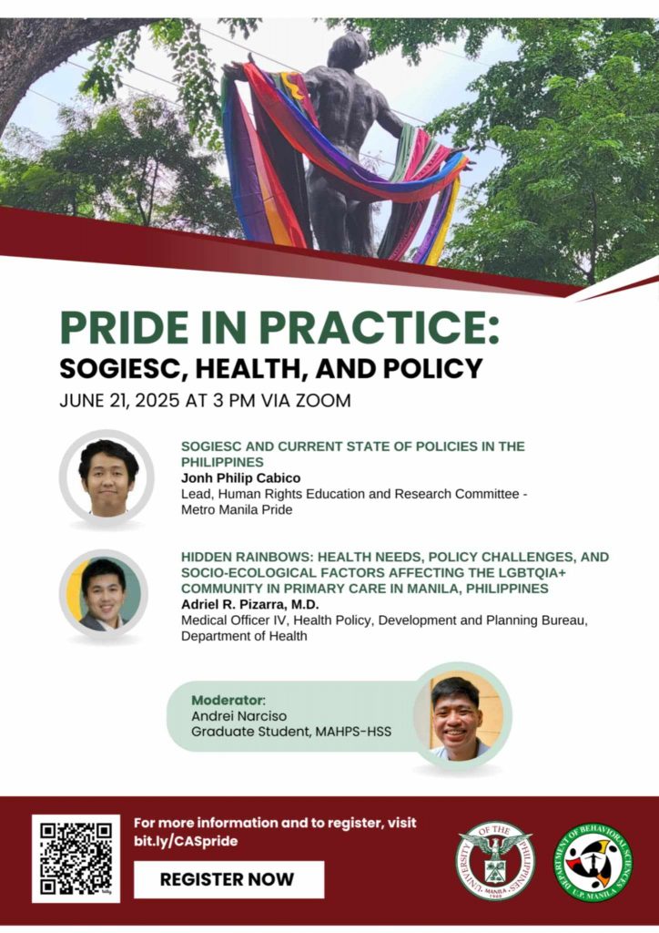 In celebration of Pride Month and in support of our commitment to diversity and inclusion, the College of Arts and Sciences, spearheaded by the Graduate Program in Health Policy Studies (Health Social Science) and the Department of Behavioral Sciences, in cooperation Metro Manila Pride (MMPride) will host “Pride in Practice: SOGIESC, Health, and Policy in Focus” on June 21, 2025, via Zoom.