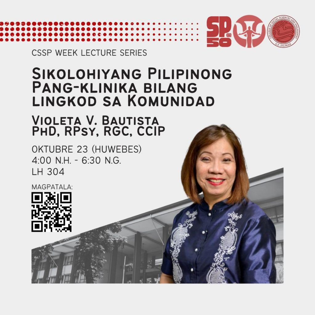 Inaanyayahan namin kayong dumalo sa lecture ng Departamento ng Sikolohiya bilang bahagi ng pagdiriwang ng Linggo ng KAPP, UP Diliman Mental Health Month, at ika-50 anibersaryo ng Sikolohiyang Pilipino (SP@50). Ito ay pinamagatang “Sikolohiyang Pilipinong Pang-Klinika bilang Lingkod sa Komunidad.” Magaganap ito sa Oktubre 23 (Huwebes), mula 4:00 n.h. hanggang 6:30 n.g., sa Lagmay Hall 304. Ito ay pangungunahan ni Propesor Emeritus Dr. Violeta V. Bautista, RPsy, RGC, CCIP.