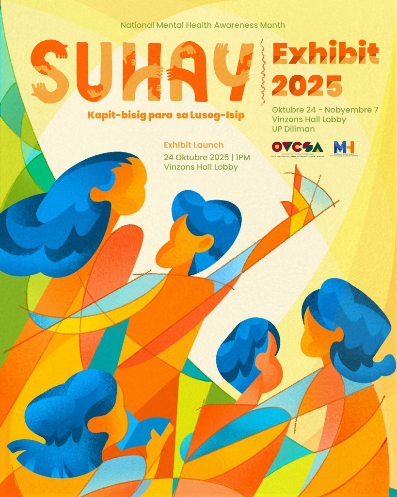 Magsama-sama tayo sa pormal na pagbubukas ng Suhay Exhibit 2025: Kapit-bisig para sa Lusog-isip at sa paglulunsad ng Humingahon Zine. Ito ay dalawang inisyatibang nagsusulong sa akto ng pagpapahinga bilang paghilom at protesta. Bahagi ito ng UP Diliman Mental Health Advocacy Month Celebration na naglalayong itaguyod ang kamalayan at pag-aalaga sa kalusugang pangkaisipan ng komunidad ng Unibersidad.