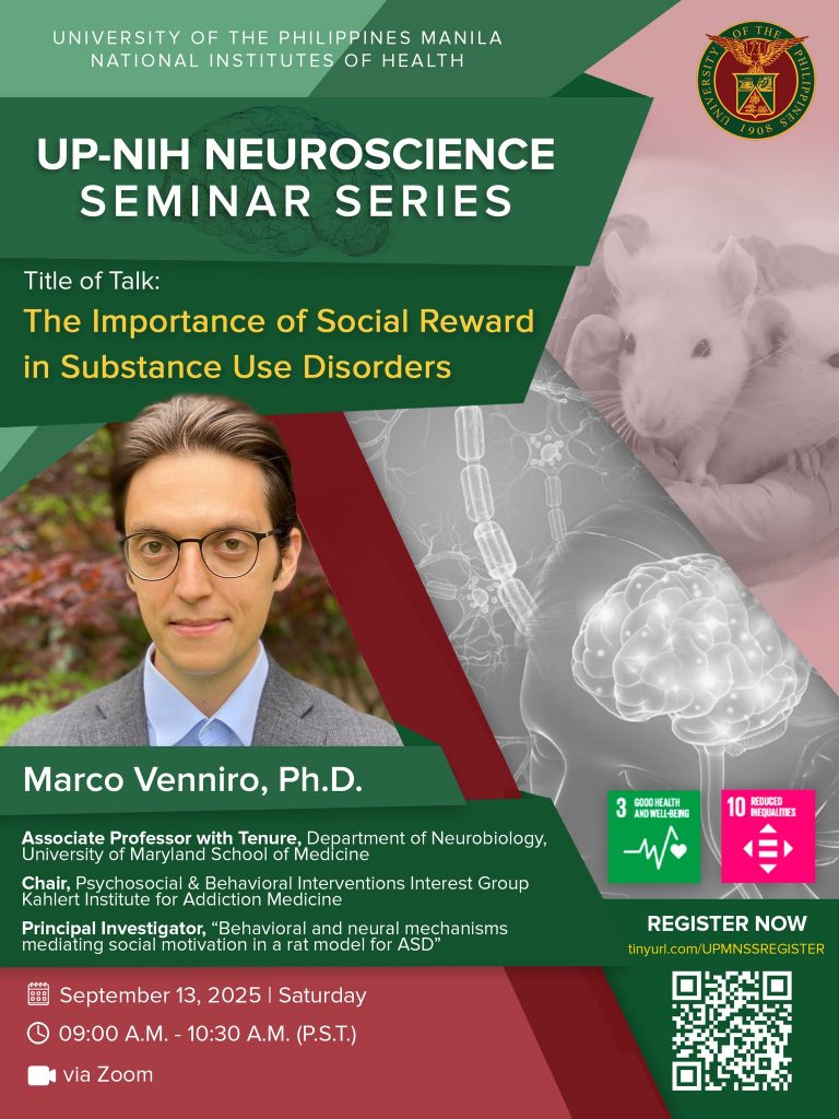 It is with great pleasure that we extend an invitation to interested participants to the eleventh run of the UP National Institutes of Health (UP-NIH) Neuroscience Seminar Series – a first of its kind and provides a unique opportunity to engage and introduce in the different fields of neuroscience from expert neuroscientists around the globe.