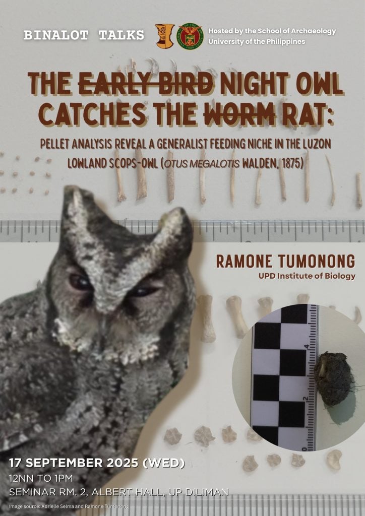 Join us this Wednesday (17 September 2025) as Ramone Tumonong discusses this and more in “The Night Owl Catches the Rat: Pellet Analysis Reveal a Generalist Feeding Niche in the Luzon Lowland Scops-owl (Otus megalotis Walden, 1875)” in Seminar Rm. 2, Albert Hall, UP Diliman from 12nn to 1pm!