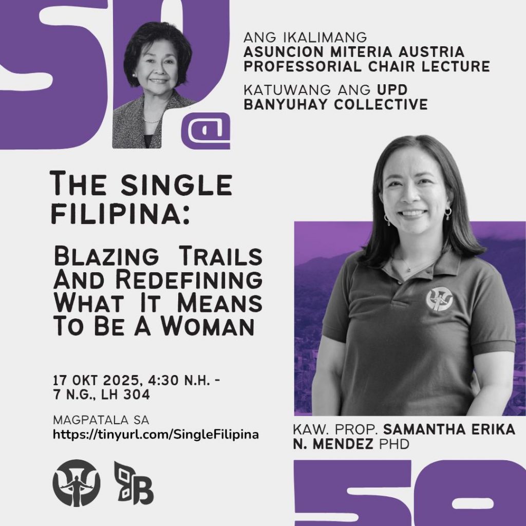 Please join us for the Asuncion Miteria Austria Professorial Chair Lecture of Dr. Samantha Erika Mendez this 17 Oktubre 2025 (Biyernes), 4:30 n.h. – 7:30 n.g., at Lagmay Hall Room 304, UP Diliman and FB Live.