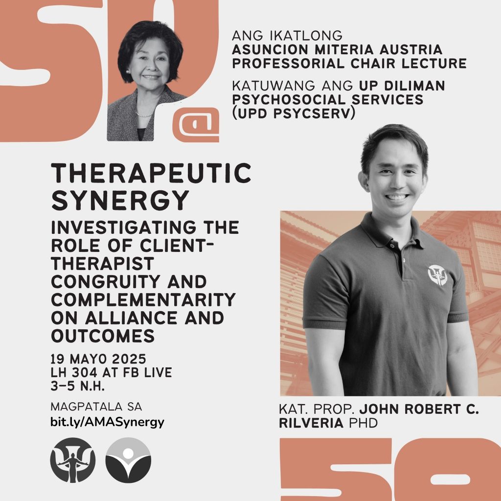 Samahan niyo kami sa Asuncion Miteria Austria Professorial Chair Lecture ni Dr. John Robert C. Rilvera sa 19 Mayo 2025 (Lunes), 3:00 n.h. – 5:00 n.h., sa Lagmay Hall Room 304, UP Diliman at FB Live. Ito ay libre at bukas sa lahat.