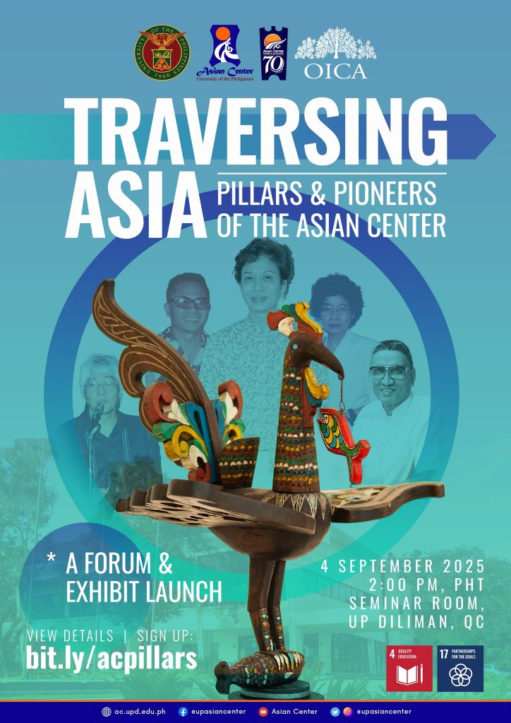 Discover the stories of the UP Asian Center, its founders, the vision that guided its early years, and the milestones that shaped its journey at “Traversing Asia: Pillars and Pioneers of the Asian Center,” an onsite forum and exhibit launch taking place on 4 September 2025, 2:00 PM (Manila Time) at the Seminar Room, UP Asian Center.