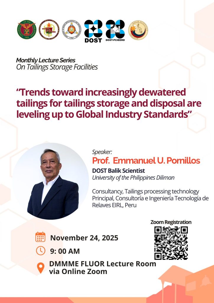 The University of the Philippines Department of Mining, Metallurgical, and Materials Engineering (UP DMMME) proudly announces the third installment of its Monthly Lecture Series on Tailings Storage Facilities.
