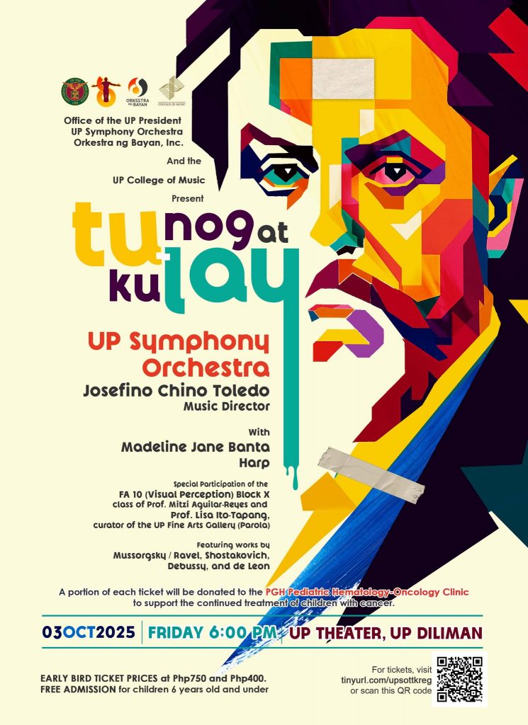 The UP Symphony Orchestra is excited to present TUNOG AT KULAY, a concert of Mussorgsky/Ravel, Debussy, Shostakovich, and de Leon with harpist Madeline Jane Banta, in support of the PGH Pediatric Hematology-Oncology Clinic. The evening also features the participation of the FA 10 (Visual Perception) Block X class of Prof. Mitzi Aguilar-Reyes and Prof. Lisa Ito-Tapang, curator of the UP Fine Arts Gallery (Parola).
