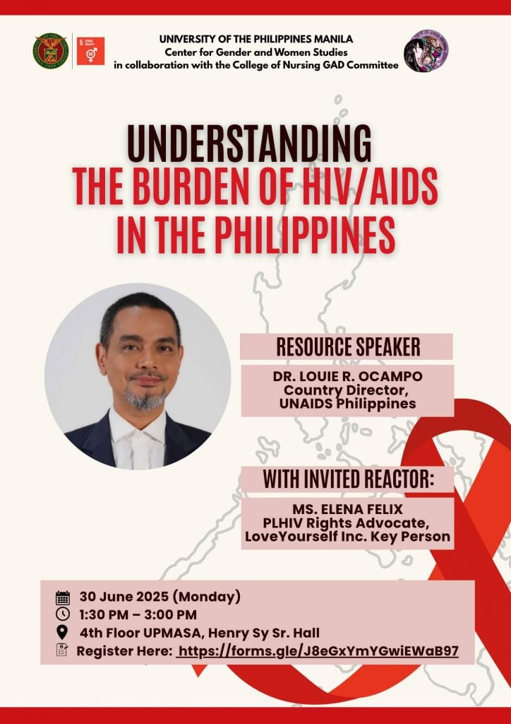 In line with the University of the Philippines Manila’s commitment to promoting gender equality and inclusivity—and in support of Sustainable Development Goal (SDG) #5: Gender Equality—the Center, in collaboration with the College of Nursing Gender and Development (GAD) Committee, is pleased to invite you to a forum entitled: “Understanding the Burden of HIV/AIDS in the Philippines”