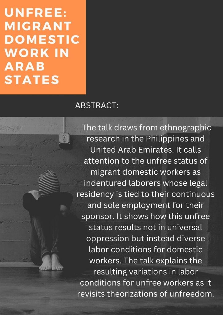 The talk draws from ethnographic research in the Philippines and United Arab Emirates. It calls attention to the unfree status of migrant domestic workers as indentured laborers whose legal residency is tied to their continuous and sole employment for their sponsor. It shows how this unfree status results not in universal oppression but instead diverse labor conditions for domestic workers. The talk explains the resulting variations in labor conditions for unfree workers as it revisits theorizations of unfreedom.