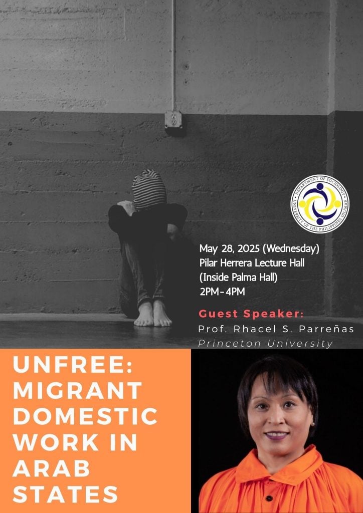 Join us for a public lecture, “Unfree: Migrant Domestic Work in Arab States” on Wednesday, May 28, 2025, from 2:00 to 4:00 PM at the Pilar Herrera Lecture Hall (inside Palma Hall).